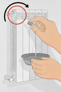 Appoggia il panno sotto la valvola (contro il termosifone) e tieni la bacinella (o il bicchiere) con l’altra mano proprio sotto.